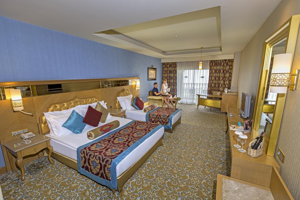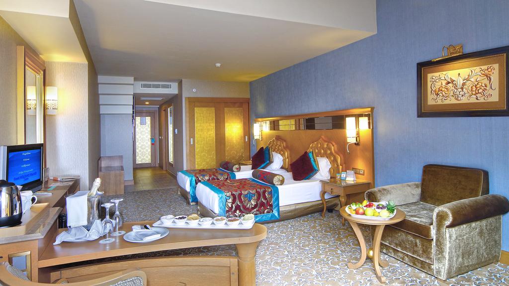 Service: Ultra all inclusive - open buffet for breakfast, late breakfast, lunch, dinner, light meals in the evening, dietary buffet and children's cupboard, light lunch at the beachside restaurant all day, all alcoholic drinks and no - local and imported alcohol, pastry, ice cream during the day. Free: A'la Carte restaurant with pre-booking and once a stay, imported luxury drinks, imported champagne, fresh fruit juices and vegetables, special wines, room service, local and imported bottled wines.